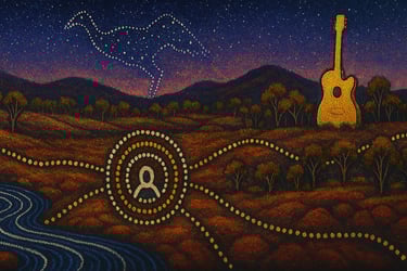 Songlines of Tamworth blends the stories I grew up with in Tamworth and the power of AI to create new visual expressions of Country. Each piece begins with my memories — the Peel River, the Moonbi Range, the Big Golden Guitar — and is composed using AI tools that interpret those stories into layered, dot-inspired artworks. We work with Kamilaroi custodians and local artists to ensure cultural care, transparency and community benefit.xt here...